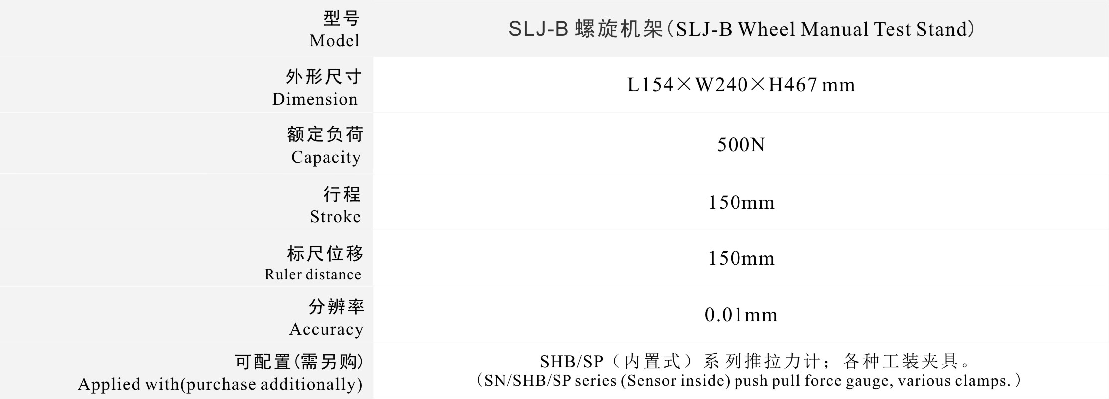 可配置(需另購):SN、SHB/SP(內(nèi)置式)推拉力計、各種工裝夾具。