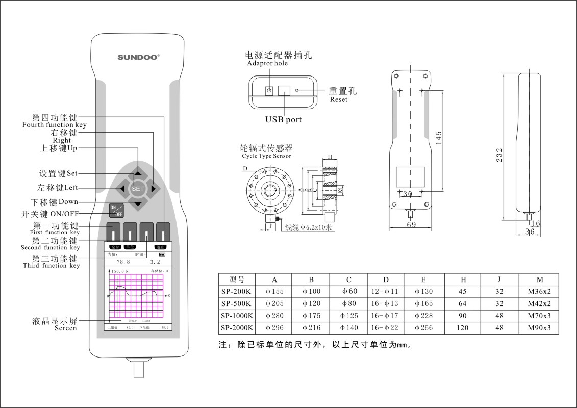 SP系列圖顯式推拉力計是我公司設(shè)計的新一代推拉力計,為全球首款采用TFT真彩顯示屏、峰值、實時力值、實時力值過程曲線同屏圖顯的推拉力計產(chǎn)品。具有體積小、重量輕、容易攜帶、測試過程可監(jiān)控可追朔、高精度等特點(diǎn),適用于各種產(chǎn)品的推拉負(fù)荷測試、插拔力測試、破壞試驗、材料強(qiáng)度測試等,并可結(jié)合各種機(jī)臺和夾具組合成不同用途的小型試驗機(jī)。