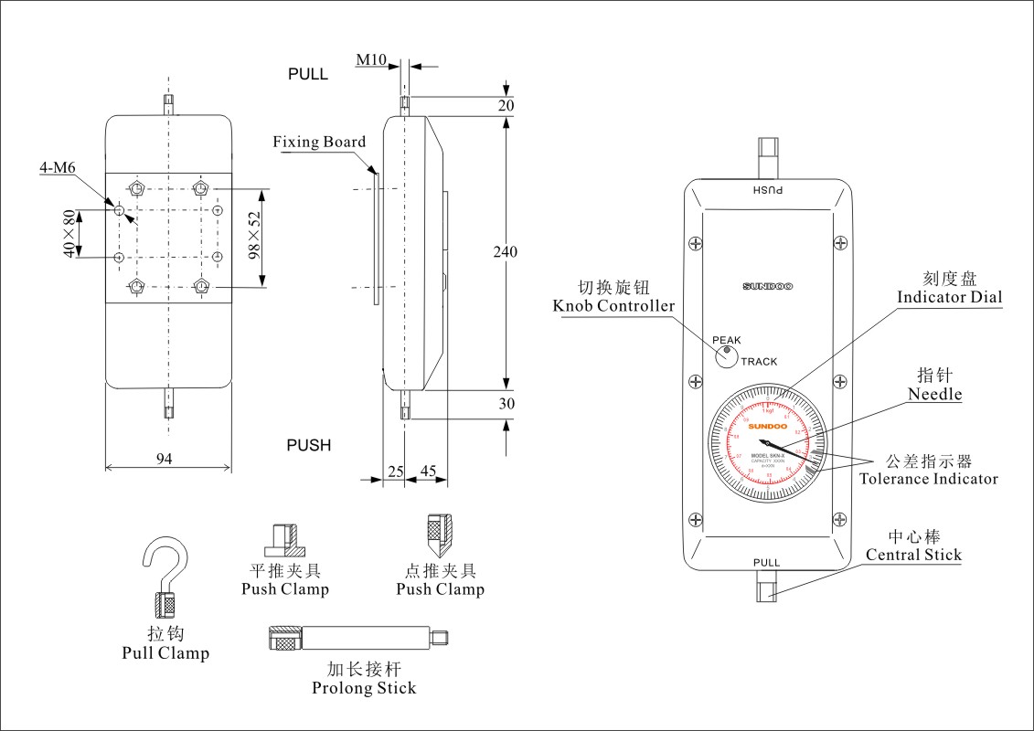 SKN系列推拉力計是小型簡便的推力、拉力測試儀器,具有高精度、易操作及攜帶方便之優(yōu)點,而且有一個峰值切換操作旋鈕,可做荷重峰值指示及連續(xù)荷重值指示。適用于電子電器、輕工紡織、建筑五金、打火機及點火裝置、消防器材、制筆、制鎖、漁具、動力機械、科研機構(gòu)等行業(yè)的推拉負(fù)荷測試,是代替管形推拉力計的新一代產(chǎn)品。