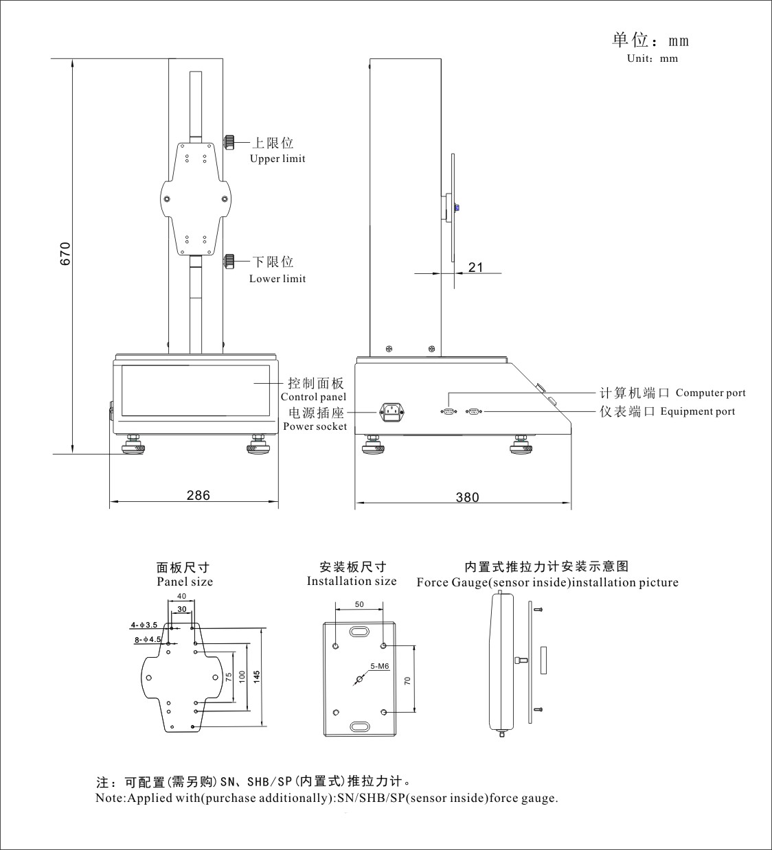 可配置(需另購):SHB/SP(2N-500N)推拉力計,各種推拉測試工裝、夾具。